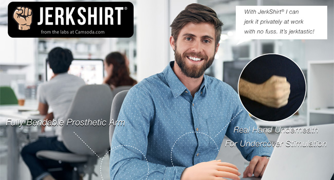 Here at the Camsoda Labs we bring you the Jerk Shirt. It's a shirt you wear with a prosthetic arm you can position anywhere. Use it to hide your hand while you do your business. It's that simple! The JerkShirt® magically covers the most important part of your body while enjoying what you do without having to hide in shame...