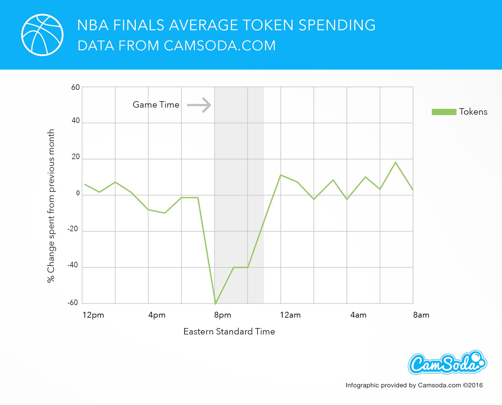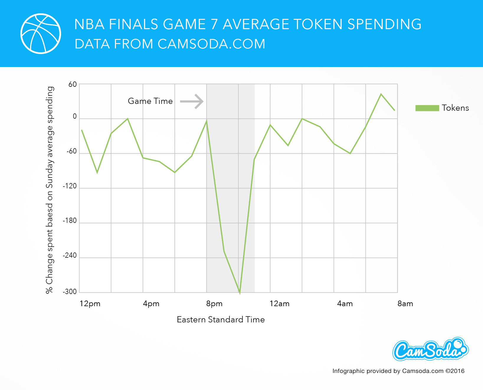 As we can see below in Game 7, the final game in the NBA Finals, token spending dropped dramatically to over -230% at 9pm EST as soon as the game started. At around 11pm we notice a sharp increase in token spending with below average results until a nice sharp increase early morning at 7am.