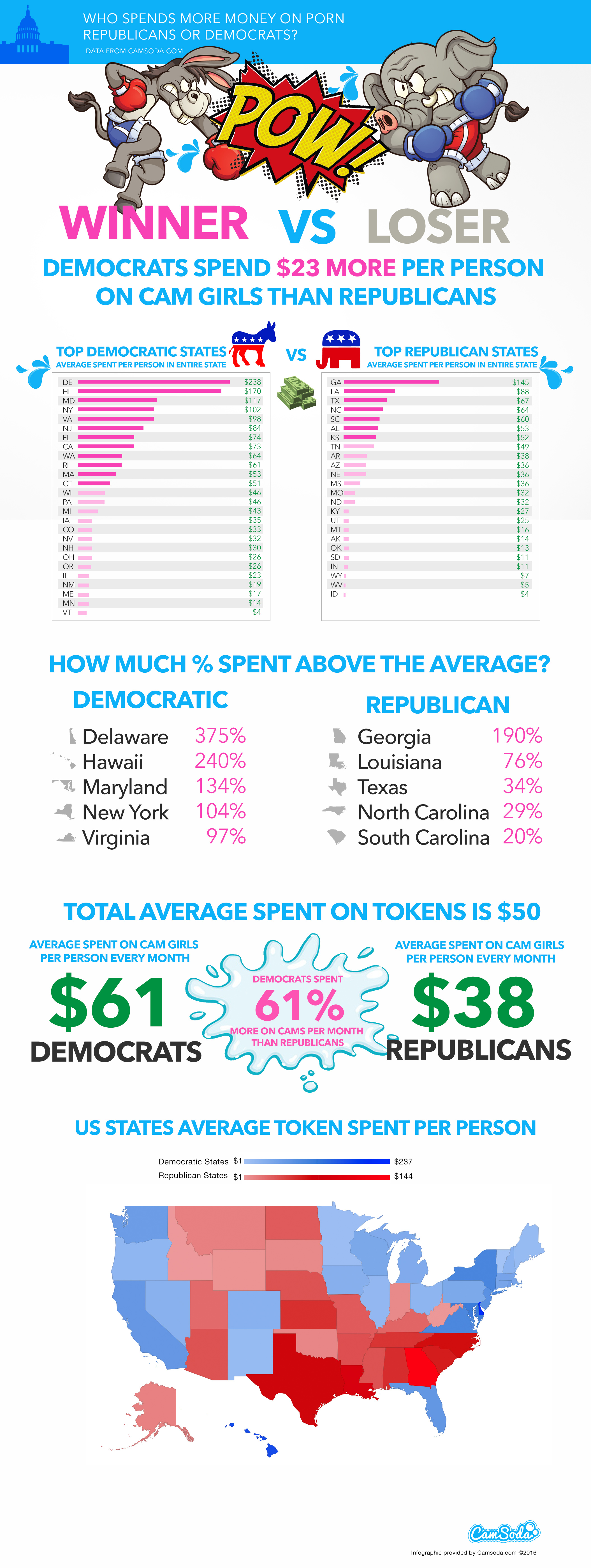Today we take a look at token spending by predominently Democrat & Republican states and come to a conclusion who spends more money on cam girls. The results may shed light on why Republicans have deemed porn a National Health Crisis. Is it just another political move to shed light that Democrats are sexual deviants? Does sexuality play a role in how you view your own political affiliation? You decide. Download full infographic here.