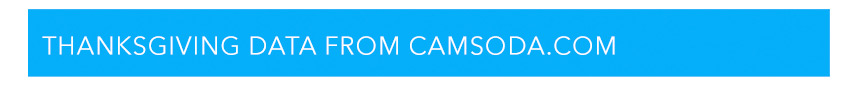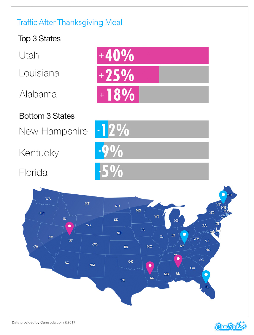 In addition to looking at mobile growth/decrease and traffic to the site throughout the day, CamSoda also provide data shedding light on what specific states see considerable traffic fluctuations throughout the day. The top 3 states with a significant uptick in traffic after a Thanksgiving meal are Utah (+40%), Louisiana (+25%) and Alabama (+18%). The bottom 3 states that see a dramatic drop in traffic to CamSoda following a Thanksgiving meal include New Hampshire (-12%), Kentucky (-9%) and Florida (-5%).