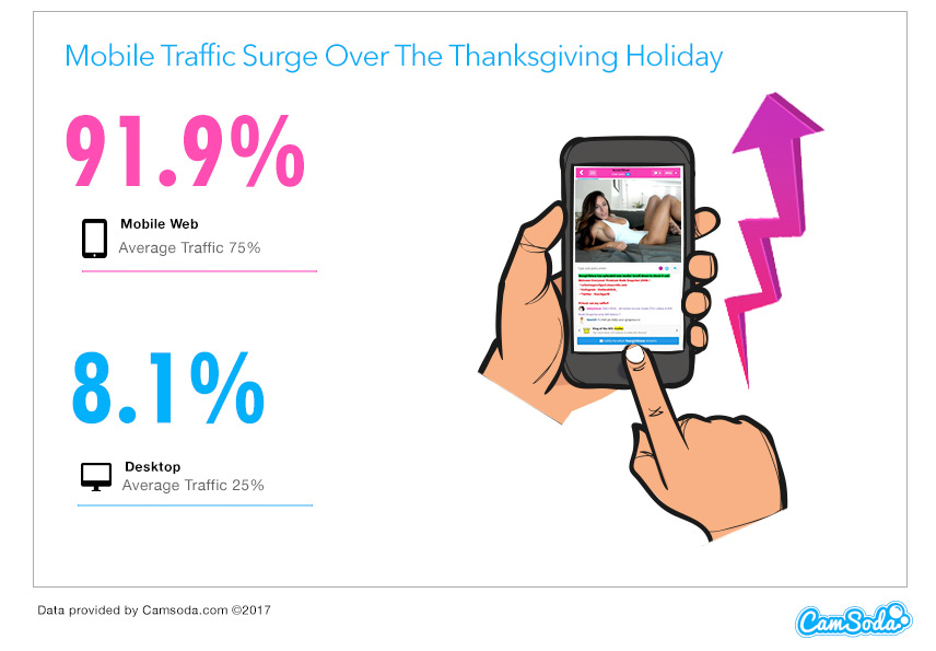 Nov 16, 2017 – CamSoda, the leading adult entertainment webcam platform, put together some data ahead of Thanksgiving, specifically around user engagement. Turns out, mobile traffic sees a dramatic uptick during the holiday, presumably because many users are amongst family and are more inclined to sneak off to a bathroom to get their XXX fix. In fact, mobile traffic to the leading XXX platform sees a 91.9% increase (as opposed to average traffic which hovers around 75%). Conversely, desktop traffic plummets, dropping to just 8.1% compared to average traffic, which is around 25%.