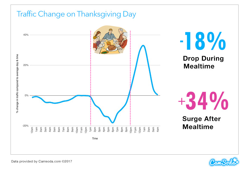 Furthermore, traffic to CamSoda on Turkey Day fluctuates considerably. Within the 1PM to 10 PM timeframe, which we estimate to be when most families sit down for dinner, there isn’t much stuffing going on on CamSoda. The platform sees an 18% drop between those hours. However, as soon as the food has been scoffed down and the dinner table cleared, there is a strong surge of traffic to CamSoda, a 34% increase. What better way to cap off a fantastic holiday than with some CamSoda fun?