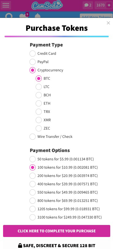 With the rise of crypto currencies and increased demand for privacy, users are now able to purchase tokens on CamSoda with crypto payment options. Tokens can be used for tips, live shows, private chats, and more.