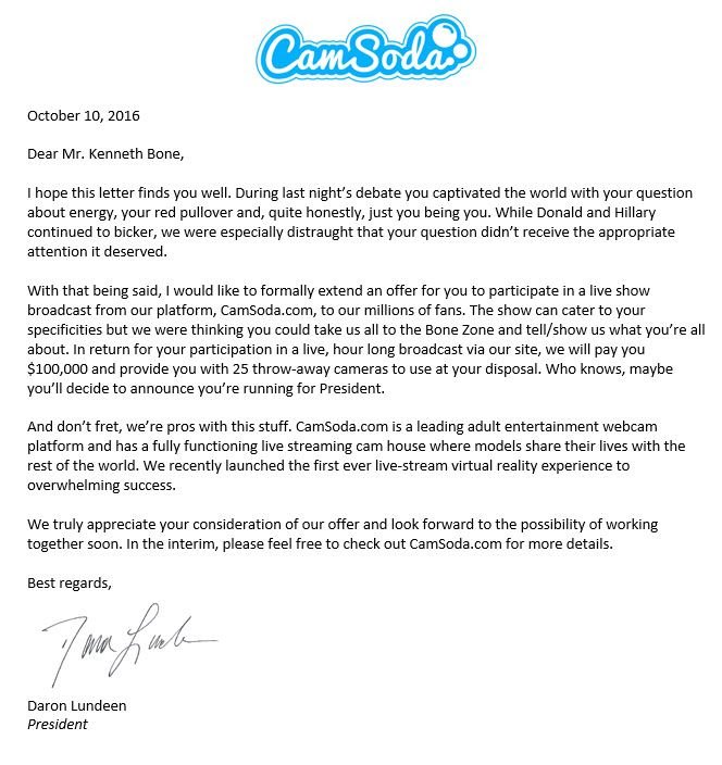 Oct 10, 2016 – Ken Bone, the undecided voter who became an Internet sensation after Sunday night's presidential debate, has been offered $100,000 to appear on Camsoda. We sent him this letter and awaiting his response.