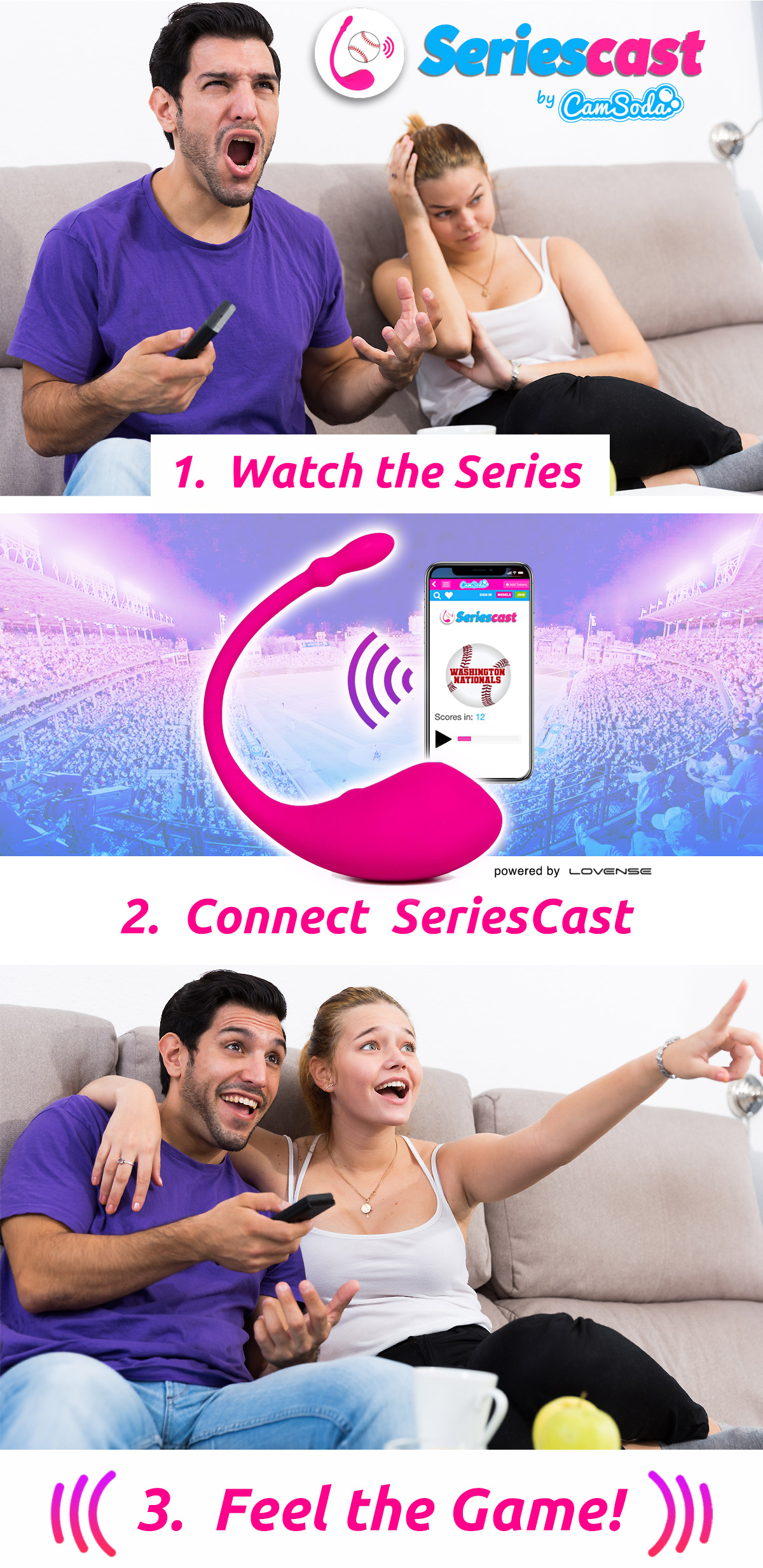 “While baseball is America’s pastime, it has been plagued by complaints from people who think the pace of play is too slow and, quite frankly, boring. And while the league has taken measures to speed up the game – introduction of instant replay, enforcing the timing clock, limiting mound visits, to name a few - it still leaves much to be desired,” said Daryn Parker, VP, CamSoda. “This is especially true for female fans, many of who are forced to watch as their diehard husband cheers on his favorite team. To provide an immersive and tantalizing experience unlike anything before, we’re introducing ‘SeriesCast.’ Now, females who are watching a baseball game can synch their Lush toy to the action on the field and legitimately enjoy the game – sexually. We’re putting an entirely new meaning to being taken out to the ball game. Make sure you root, root, root for the home team.”