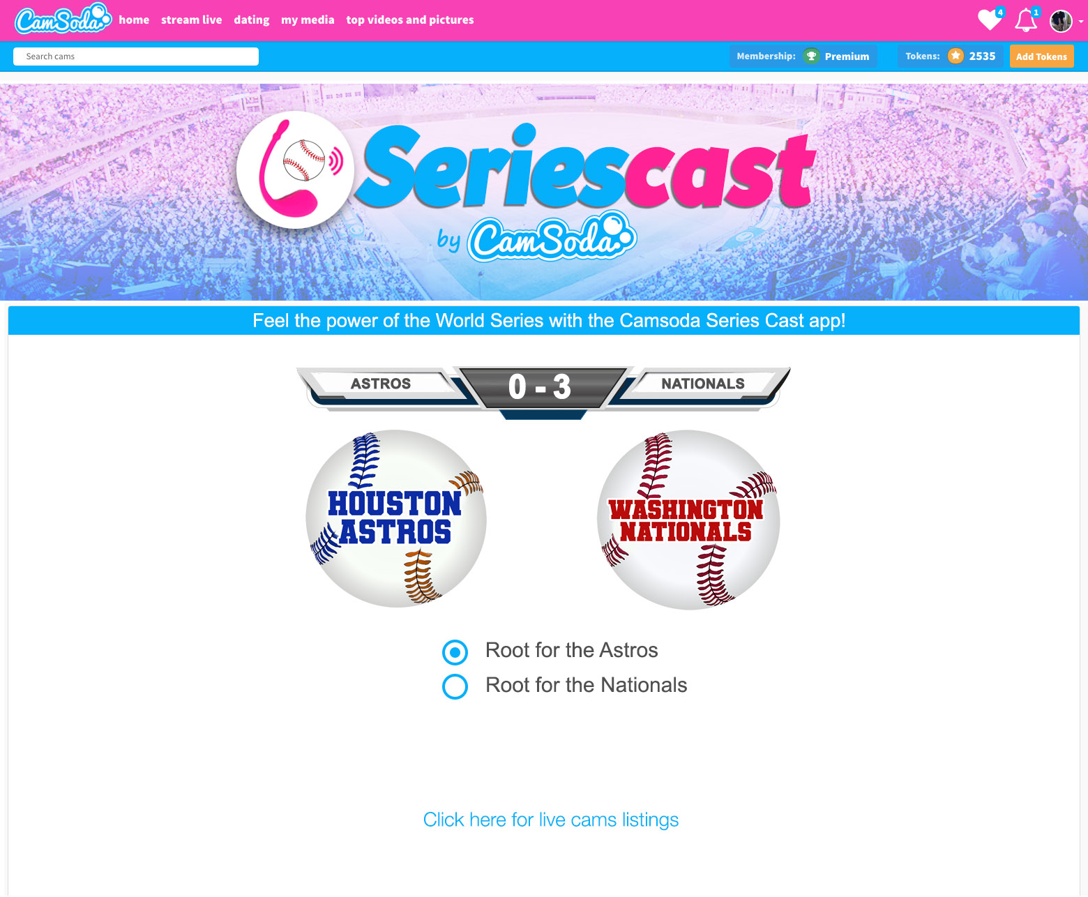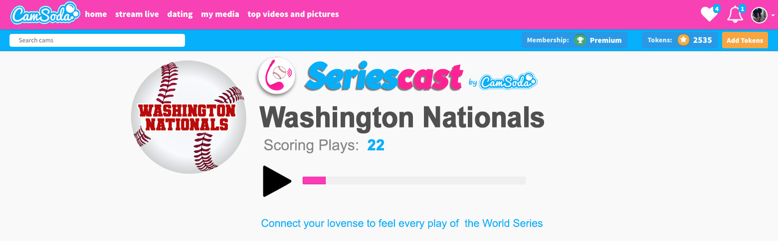 Oct. 22, 2019 – CamSoda today announced the launch of “SeriesCast,” a new and exciting way for women to enjoy the World Series. SeriesCast allows individuals with a connected live sex toy (Lovense Lush) to synch it with World Series games.