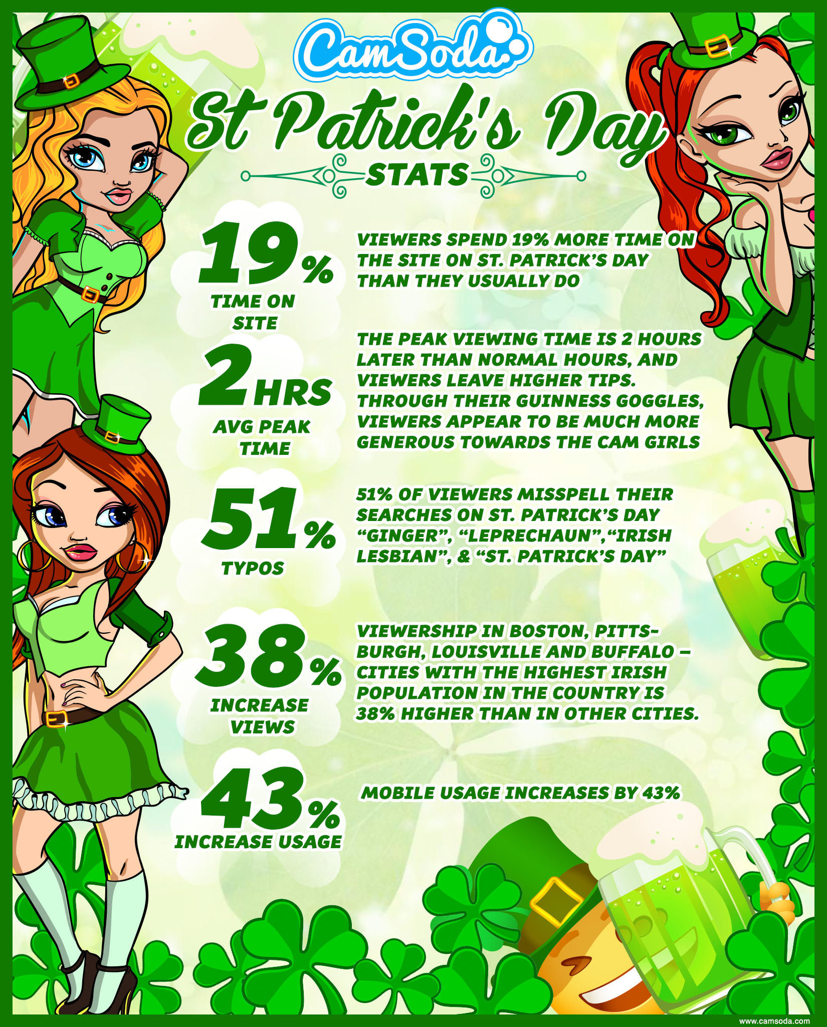 Mar 15, 2019 – According to the statisticians at CamSoda, viewership to the leading adult entertainment webcam platform sees a dramatic uptick on St. Patrick’s Day. Specifically: