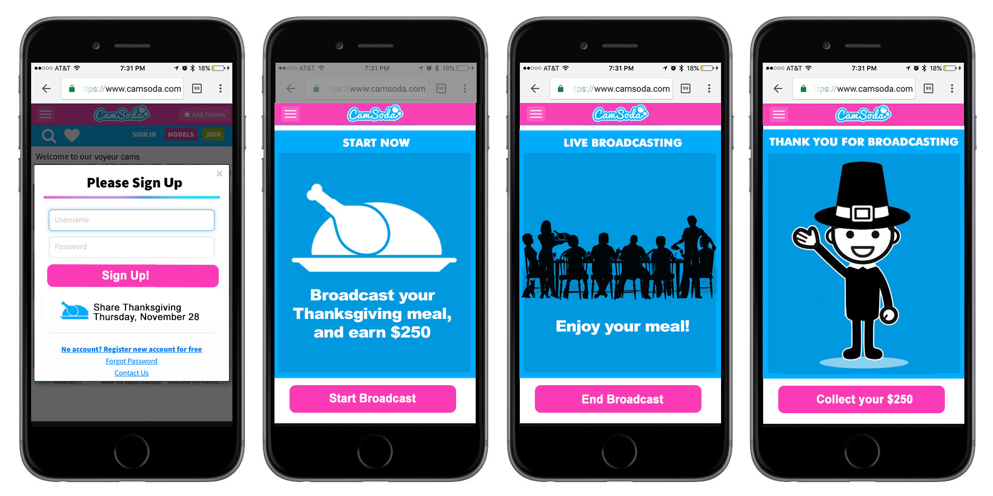November 20, 2019 – With Thanksgiving fast approaching, CamSoda is lending a helping hand and offering people the opportunity to live stream their Thanksgiving dinner for the world to see. In return for people broadcasting their dinnertime shenanigans – stuffing their faces with turkey and mashed potatoes – the adult entertainment camming platform will pay for their dinner (up to $250). Now, not only do adults get to join in on the live streaming craze and get a free meal from it, but those who are lonely this holiday can now enjoy the company of others from afar with the quick click of a button. CamSoda will create a brand new category on the site specifically for Thanksgiving dinner broadcasts.