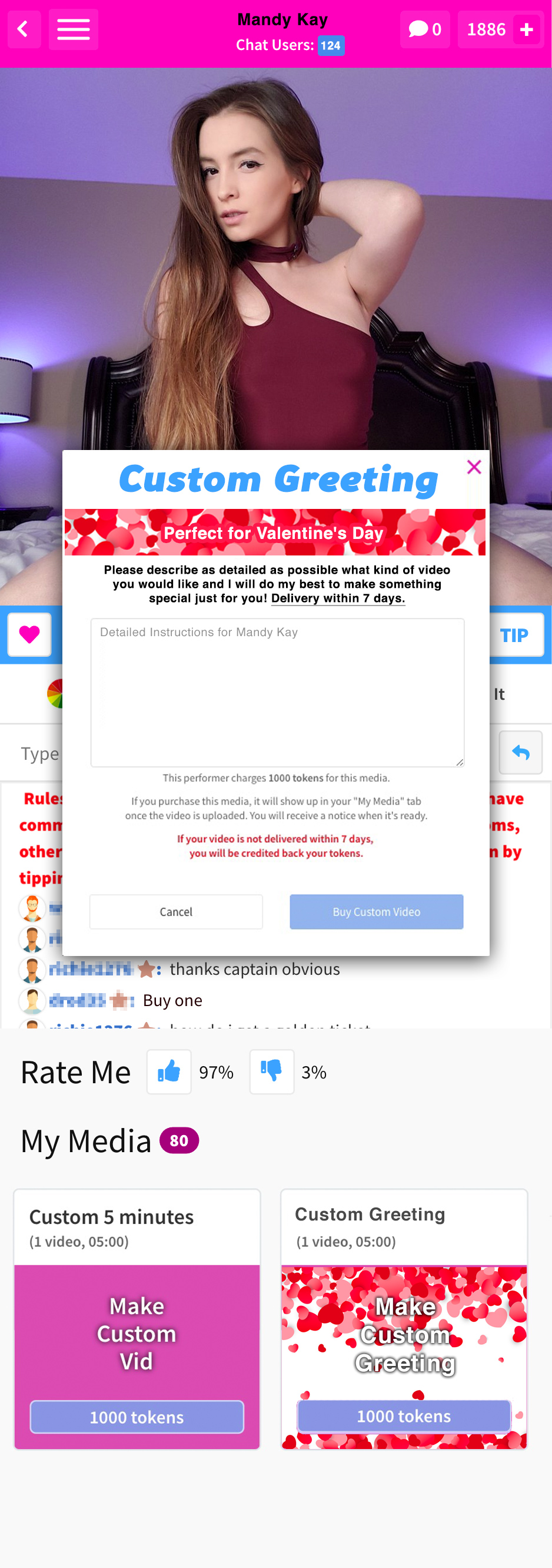 Users can also select specific participating cam models and famous adult stars like Brandi Love, Dani Daniels and Tori Black, via their profile pages. The process is identical to the crowd-sourced greeting, except users get to pick their model or porn star. Pricing for this varies depending on the model and what is requested, outfit choice, amount of clothing worn, and desired level of naughtiness.